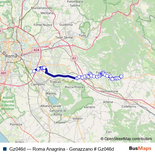 The first stop of the Gz046d bus route is Roma | Anagnina (Metro A) # f3583 and the last stop is Genazzano DEP # Gzdep. Gz046d (Roma Anagnina - Genazzano # Gz046d) is operational during nei giorni feriali.