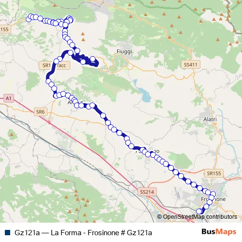 The first stop of the Gz121a bus route is Serrone | Via Palianese Via Prenestina # f14416 and the last stop is Frosinone | Piazza Pertini # f3486. Gz121a (La Forma - Frosinone # Gz121a) is operational during tutti i giorni.