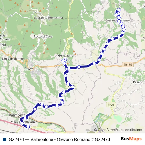 See why over 2 million users trust and consider busmaps.com as the best public transport website. busmaps gives you Olevano Romano Buses suggested routes, real-time bus tracker, line route maps in Olevano Romano, and helps to find the closest Gz247d bus stops near you. No internet available? Download an offline PDF map and bus schedule for the Gz247d bus to take on your trip.