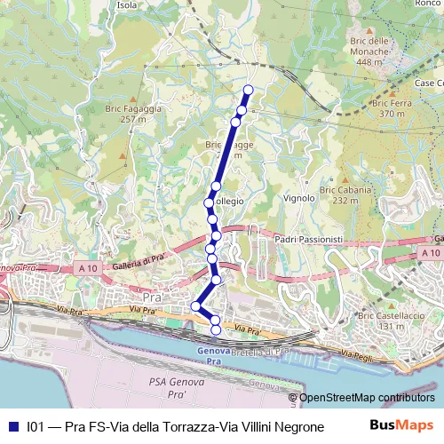 The first stop of the I01 bus route is PRA' FS/Capolinea and the last stop is Torrazza/Capolinea. I01 (Pra FS-Via della Torrazza-Via Villini Negrone) is operational during tutti i giorni.