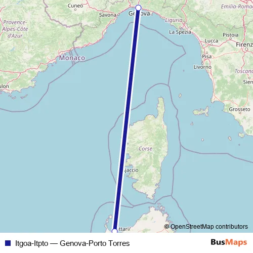 The first stop of the Itgoa-Itpto ferry route is Genova and the last stop is Porto Torres. Itgoa-Itpto (Genova-Porto Torres) is operational during tutti i giorni.