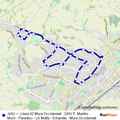 Bus Je52 - Linea 52 Mura Occidentali - SAN P. Martire - Murri - Paradiso - LA Malfa - Erbarella - Mura Occidentali Schedule in Jesi