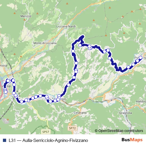 The first stop of the L31 bus route is Fivizzano Capolinea and the last stop is Aulla. L31 (Aulla-Serricciolo-Agnino-Fivizzano) is operational during tutti i giorni.