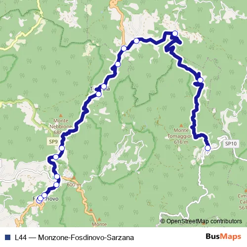The first stop of the L44 bus route is Fosdinovo and the last stop is Marciaso. L44 (Monzone-Fosdinovo-Sarzana) is operational during tutti i giorni.
