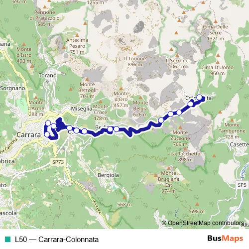 The first stop of the L50 bus route is Colonnata and the last stop is Carrara Ospedale. L50 (Carrara-Colonnata) is operational during tutti i giorni.