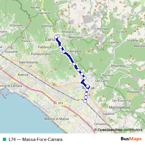 The first stop of the L74 bus route is Carrara Ospedale and the last stop is Massa Fs. L74 (Massa-Foce-Carrara) is operational during tutti i giorni.