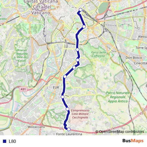 See why over 2 million users trust and consider busmaps.com as the best public transport website. busmaps gives you Rome Buses suggested routes, real-time bus tracker, line route maps in Rome, and helps to find the closest L80 bus stops near you. No internet available? Download an offline PDF map and bus schedule for the L80 bus to take on your trip.