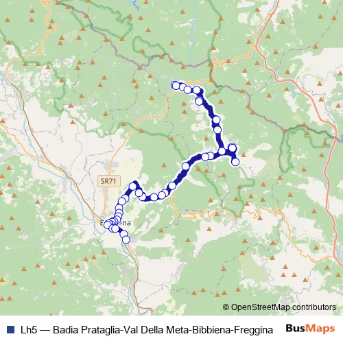 The first stop of the Lh5 bus route is Badia Prataglia P.Zza Del Mercato and the last stop is Corsalone Deposito. Lh5 (Badia Prataglia-Val Della Meta-Bibbiena-Freggina) is operational during tutti i giorni.