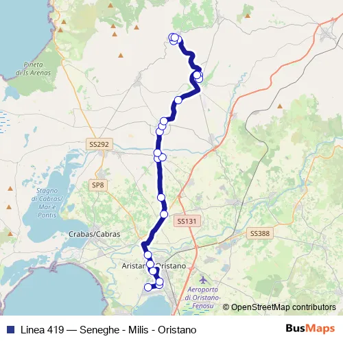 The first stop of the Linea 419 bus route is Oristano Z.I. and the last stop is Seneghe Corso Umberto 117. Linea 419 (Seneghe - Milis - Oristano) is operational during tutti i giorni.