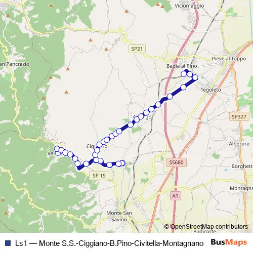 The first stop of the Ls1 bus route is Verniana Alta and the last stop is Badia Al Pino Stazione. Ls1 (Monte S.S.-Ciggiano-B.Pino-Civitella-Montagnano) is operational during tutti i giorni.