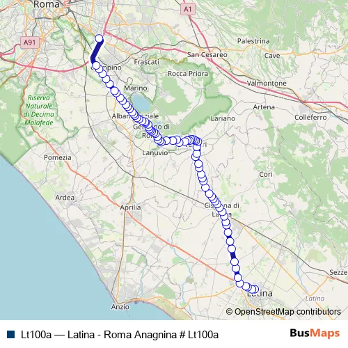The first stop of the Lt100a bus route is Latina | Terminal Bus # f3092 and the last stop is Roma | Anagnina (Metro A) # f3582. Lt100a (Latina - Roma Anagnina # Lt100a) is operational during tutti i giorni.
