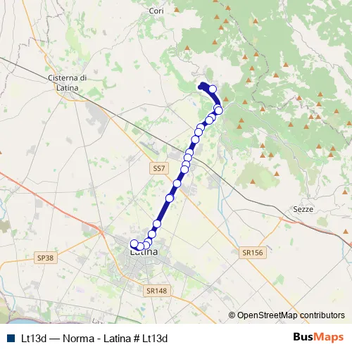 The first stop of the Lt13d bus route is Norma | Piazza Roma # f3077 and the last stop is Latina | Terminal Bus # f3092. Lt13d (Norma - Latina # Lt13d) is operational during tutti i giorni.