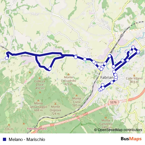 The first stop of the Melano - Marischio bus route is Fabriano - Porta DEL Piano and the last stop is Fabriano - Porta DEL Borgo. Melano - Marischio (Melano - Marischio) is operational during nei giorni feriali.