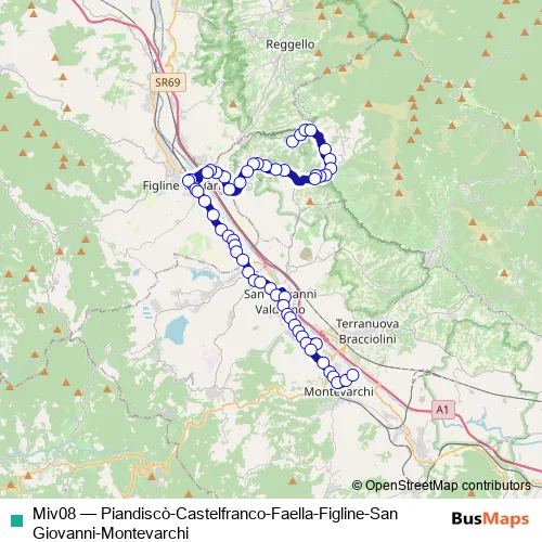 The first stop of the Miv08 bus route is Pian Di Sco' Via Larga Casa Serena and the last stop is Montevarchi Liceo. Miv08 (Piandiscò-Castelfranco-Faella-Figline-San Giovanni-Montevarchi) is operational during tutti i giorni.