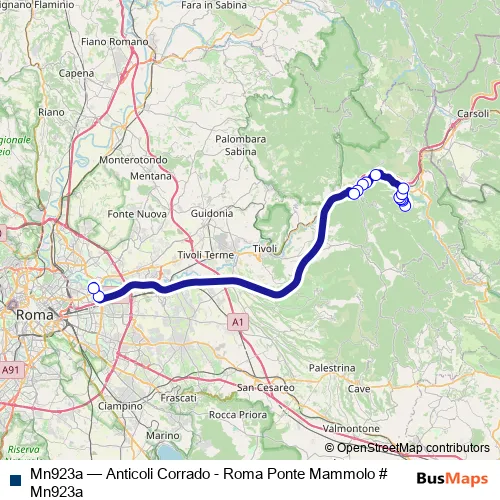 The first stop of the Mn923a bus route is Anticoli Corrado (Stadio) # f00087 and the last stop is Roma | Ponte Mammolo (Metro B) # f9021. Mn923a (Anticoli Corrado - Roma Ponte Mammolo # Mn923a) is operational during nei giorni feriali.