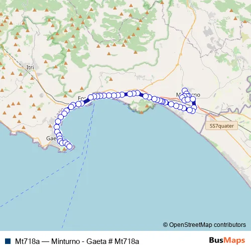 The first stop of the Mt718a bus route is Minturno | Piazzale Riccardelli # f4557 and the last stop is Gaeta | Piazzale Caboto # f4218. Mt718a (Minturno - Gaeta # Mt718a) is operational during tutti i giorni.