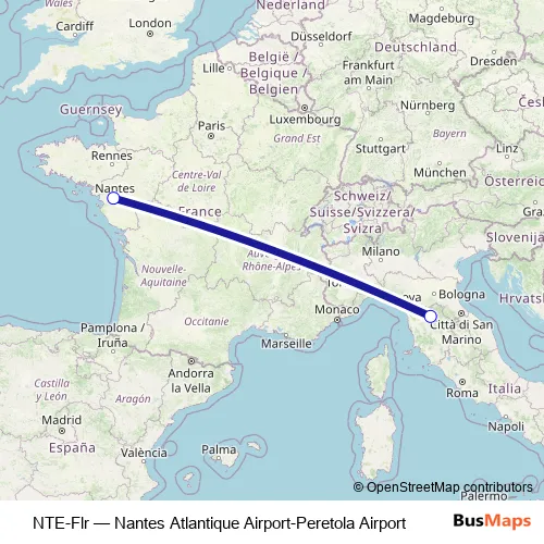 The first stop of the NTE-Flr bus route is Aéroport de Florence and the last stop is Aéroport Nantes Atlantique. NTE-Flr (Nantes Atlantique Airport-Peretola Airport) is operational during tutti i giorni.