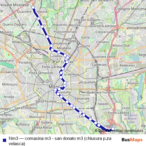 The first stop of the Nm3 bus route is san donato m3 and the last stop is comasina m3. Nm3 (comasina m3 - san donato m3 (chiusura p.za velasca)) is operational during tutti i giorni.