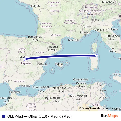 The first stop of the OLB-Mad air route is Aeroporto di Madrid (Mad) and the last stop is Aeroporto di Olbia (Olb). OLB-Mad (Olbia (OLB) - Madrid (Mad)) is operational during tutti i giorni.