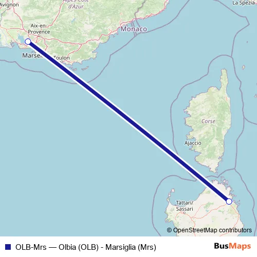 The first stop of the OLB-Mrs air route is Aeroporto di Olbia (Olb) and the last stop is Aeroporto di Marsiglia (Mrs). OLB-Mrs (Olbia (OLB) - Marsiglia (Mrs)) is operational during tutti i giorni.