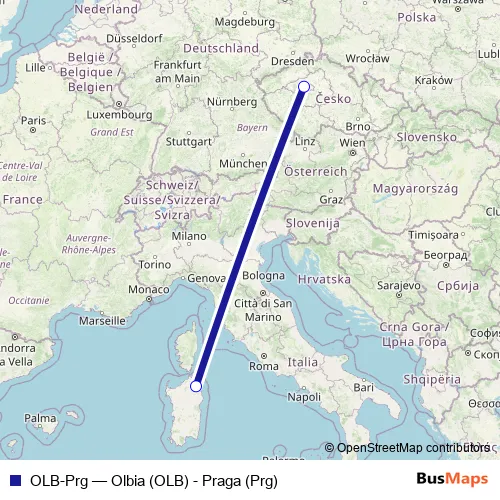 The first stop of the OLB-Prg air route is Aeroporto di Praga (Prg) and the last stop is Aeroporto di Olbia (Olb). OLB-Prg (Olbia (OLB) - Praga (Prg)) is operational during nel fine settimana.