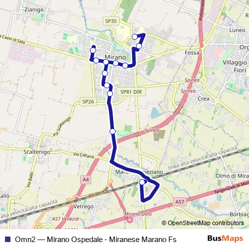 The first stop of the Omn2 bus route is Mirano Ospedale and the last stop is Miranese Marano Fs. Omn2 (Mirano Ospedale - Miranese Marano Fs) is operational during nei giorni feriali.