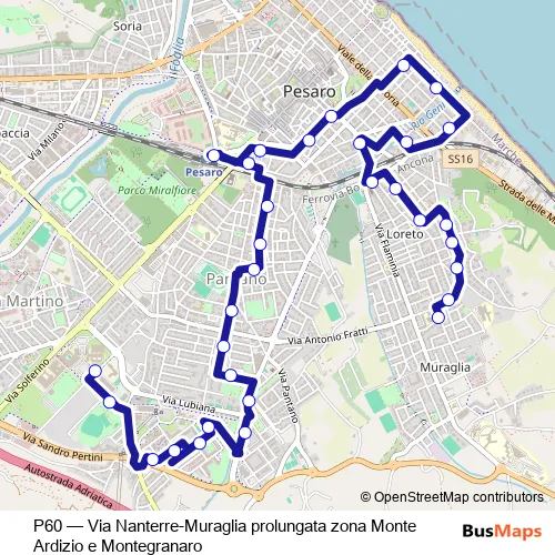 See why over 2 million users trust and consider busmaps.com as the best public transport website. busmaps gives you Pesaro Buses suggested routes, real-time bus tracker, line route maps in Pesaro, and helps to find the closest P60 bus stops near you. No internet available? Download an offline PDF map and bus schedule for the P60 bus to take on your trip.