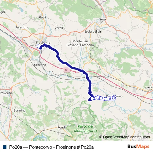 The first stop of the Po20a bus route is Pontecorvo | Ospedale # f4299 and the last stop is Frosinone | Piazza Pertini # f3486. Po20a (Pontecorvo - Frosinone # Po20a) is operational during nei giorni feriali.
