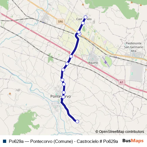 The first stop of the Po629a bus route is Pontecorvo DEP # Podep and the last stop is Castrocielo | Via Roma # f7206. Po629a (Pontecorvo (Comune) - Castrocielo # Po629a) is operational during tutti i giorni.