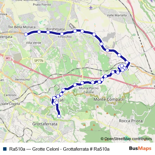 The first stop of the Ra510a bus route is Roma | Grotte Celoni (Metro C) # f13236 and the last stop is Grottaferrata | Via 24 Maggio (Villa Cavalletti) # f12994. Ra510a (Grotte Celoni - Grottaferrata # Ra510a) is operational during nei giorni feriali.