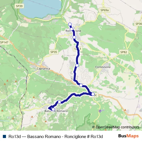 The first stop of the Ro13d bus route is Bassano R. | Via Stazione Via 24 Maggio # f2604 and the last stop is Ronciglione | Via Cimina Via Cartiere # f2513. Ro13d (Bassano Romano - Ronciglione # Ro13d) is operational during tutti i giorni.