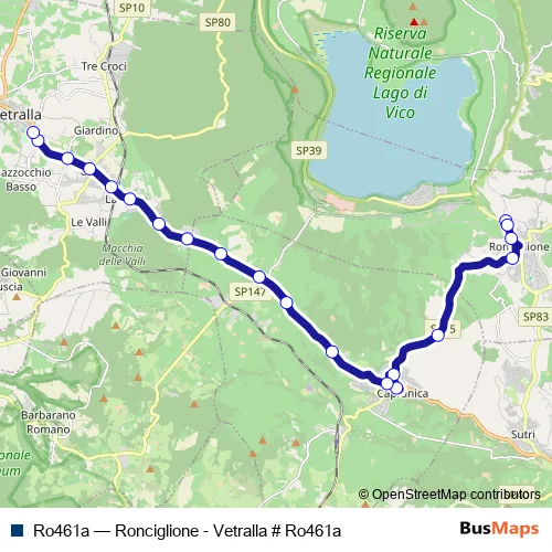 The first stop of the Ro461a bus route is Ronciglione | Via Cimina Via Cartiere # f2513 and the last stop is Vetralla | Via Cassia Via Cappuccini # f568. Ro461a (Ronciglione - Vetralla # Ro461a) is operational during tutti i giorni.