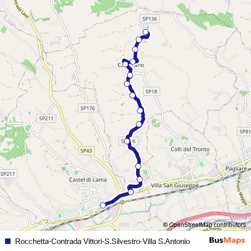 The first stop of the Rocchetta-Contrada Vittori-S.Silvestro-Villa S.Antonio bus route is Rocchetta DI Castorano and the last stop is