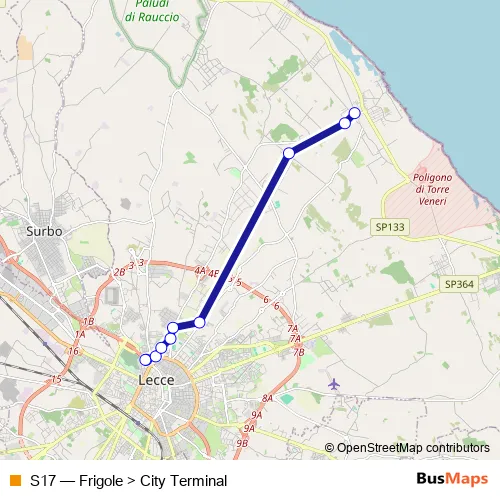 See why over 2 million users trust and consider busmaps.com as the best public transport website. busmaps gives you Lecce Buses suggested routes, real-time bus tracker, line route maps in Lecce, and helps to find the closest S17 bus stops near you. No internet available? Download an offline PDF map and bus schedule for the S17 bus to take on your trip.