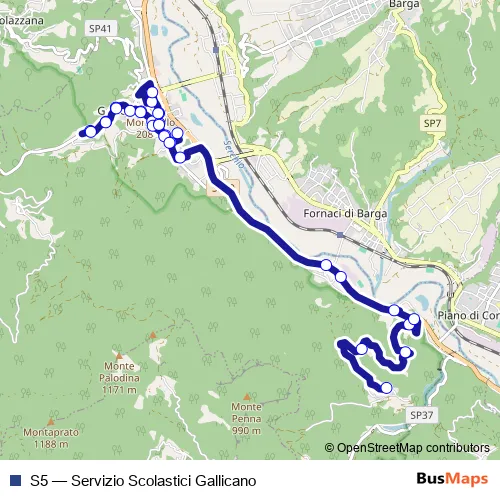The first stop of the S5 bus route is Gallicano Scuole and the last stop is Gallicano Scuole (Arrivo). S5 (Servizio Scolastici Gallicano) is operational during tutti i giorni.