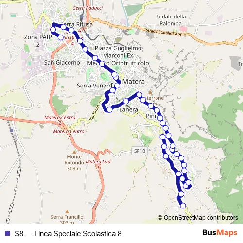 See why over 2 million users trust and consider busmaps.com as the best public transport website. busmaps gives you Matera Buses suggested routes, real-time bus tracker, line route maps in Matera, and helps to find the closest S8 bus stops near you. No internet available? Download an offline PDF map and bus schedule for the S8 bus to take on your trip.