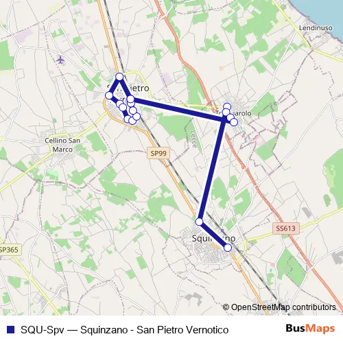 The first stop of the SQU-Spv bus route is Squinzano - Via Lecce 2 and the last stop is San Pietro V.co - Piazzale Stazione. SQU-Spv (Squinzano - San Pietro Vernotico) is operational during tutti i giorni.