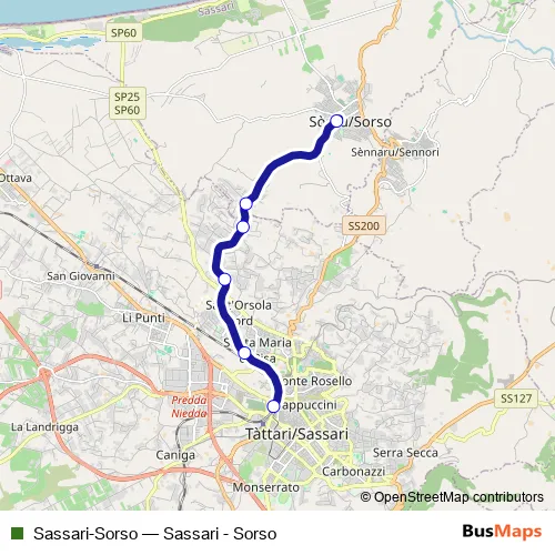 The first stop of the Sassari-Sorso rail route is Sorso and the last stop is Sassari. Sassari-Sorso (Sassari - Sorso) is operational during tutti i giorni.