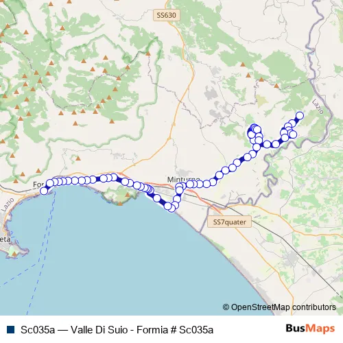 The first stop of the Sc035a bus route is Castelforte | Valle di Suio # f4591 and the last stop is Formia | Porto # f99992. Sc035a (Valle Di Suio - Formia # Sc035a) is operational during tutti i giorni.