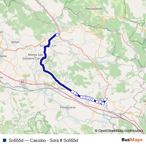 The first stop of the So555d bus route is Cassino | Via San Bartolomeo Via Casilina # f8131 and the last stop is Sora | Stazione FS # f5890. So555d (Cassino - Sora # So555d) is operational during tutti i giorni.