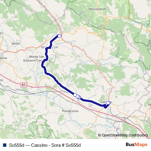 The first stop of the So555d bus route is Cassino | Via San Bartolomeo Via Casilina # f8131 and the last stop is Sora | Stazione FS # f5890. So555d (Cassino - Sora # So555d) is operational during tutti i giorni.