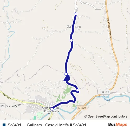 The first stop of the So849d bus route is Gallinaro | Municipio # f7770 and the last stop is Atina | Corso Munanzio Planco # f7533. So849d (Gallinaro - Case di Melfa # So849d) is operational during tutti i giorni.
