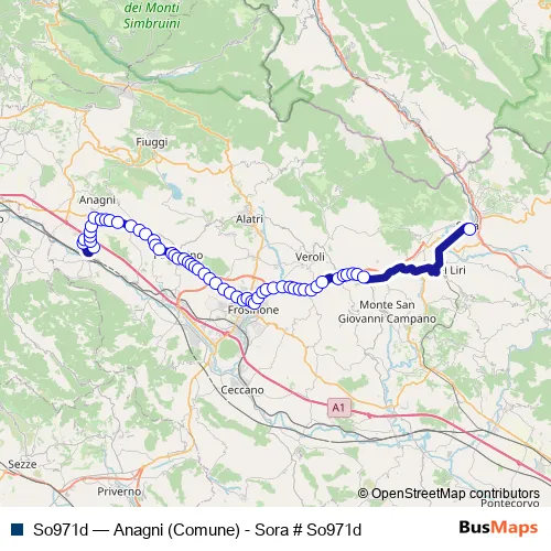 The first stop of the So971d bus route is Anagni | Via Fontana Ceraso # f5121 and the last stop is Sora | Stazione FS # f5890. So971d (Anagni (Comune) - Sora # So971d) is operational during tutti i giorni.