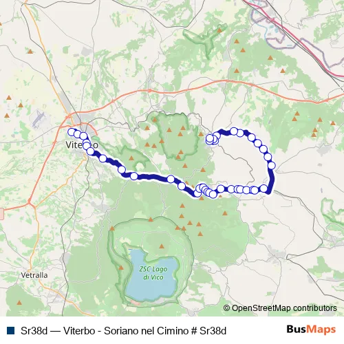 The first stop of the Sr38d bus route is Viterbo | Riello # f641 and the last stop is Soriano | Stazione # f1744. Sr38d (Viterbo - Soriano nel Cimino # Sr38d) is operational during tutti i giorni.