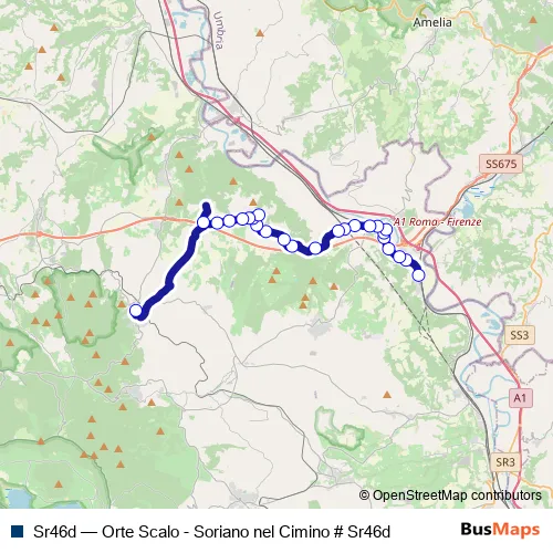 The first stop of the Sr46d bus route is Orte | Stazione FS # f1703 and the last stop is Soriano | Stazione # f1744. Sr46d (Orte Scalo - Soriano nel Cimino # Sr46d) is operational during tutti i giorni.