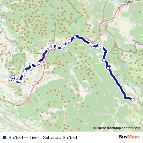 The first stop of the Su753d bus route is Tivoli | Piazzale Nazioni Unite # f8977 and the last stop is Subiaco | Piazza Falcone # f4782. Su753d (Tivoli - Subiaco # Su753d) is operational during tutti i giorni.