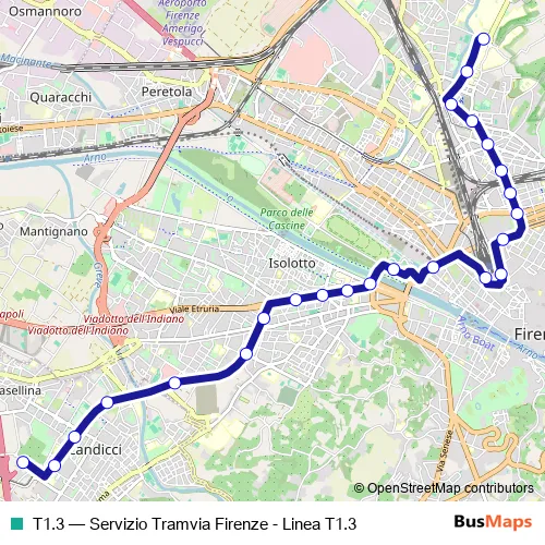 See why over 2 million users trust and consider busmaps.com as the best public transport website. busmaps gives you Florence Trams suggested routes, real-time bus tracker, line route maps in Florence, and helps to find the closest T1.3 tram stops near you. No internet available? Download an offline PDF map and bus schedule for the T1.3 tram to take on your trip.