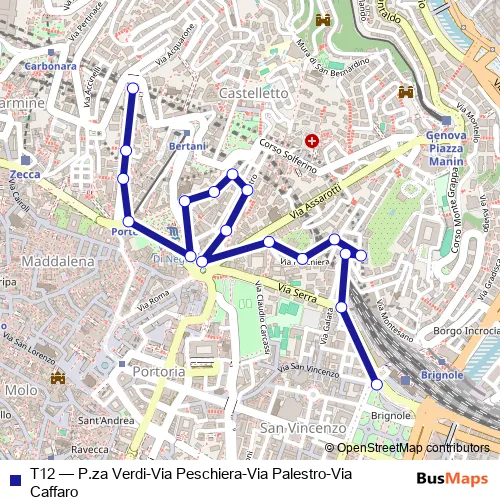 The first stop of the T12 bus route is Brignole FS/Capolinea and the last stop is Caffaro 3. T12 (P.za Verdi-Via Peschiera-Via Palestro-Via Caffaro) is operational during tutti i giorni.