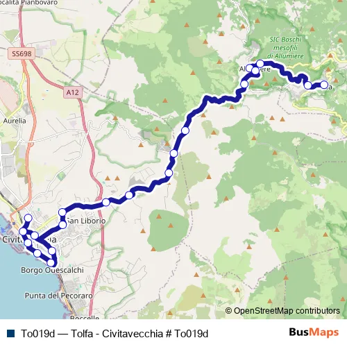 The first stop of the To019d bus route is Tolfa | piazza Vittorio Veneto # f254 and the last stop is Civitavecchia | Deposito # f277. To019d (Tolfa - Civitavecchia # To019d) is operational during tutti i giorni.