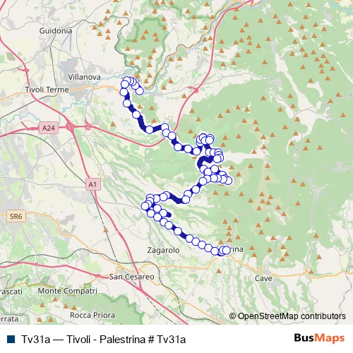 The first stop of the Tv31a bus route is Tivoli | Largo Saragat # f11701 and the last stop is Palestrina | Porta del Sole # f12262. Tv31a (Tivoli - Palestrina # Tv31a) is operational during tutti i giorni.